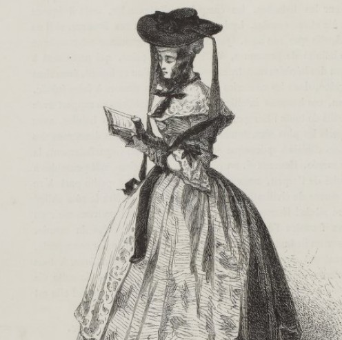 COSTUME Chapeau de velours noir de ceux qu on nomme à la Paméla robe longue de soie grise rubans noirs longs cheveux bouclés dont les repentirs flottent sur le sein